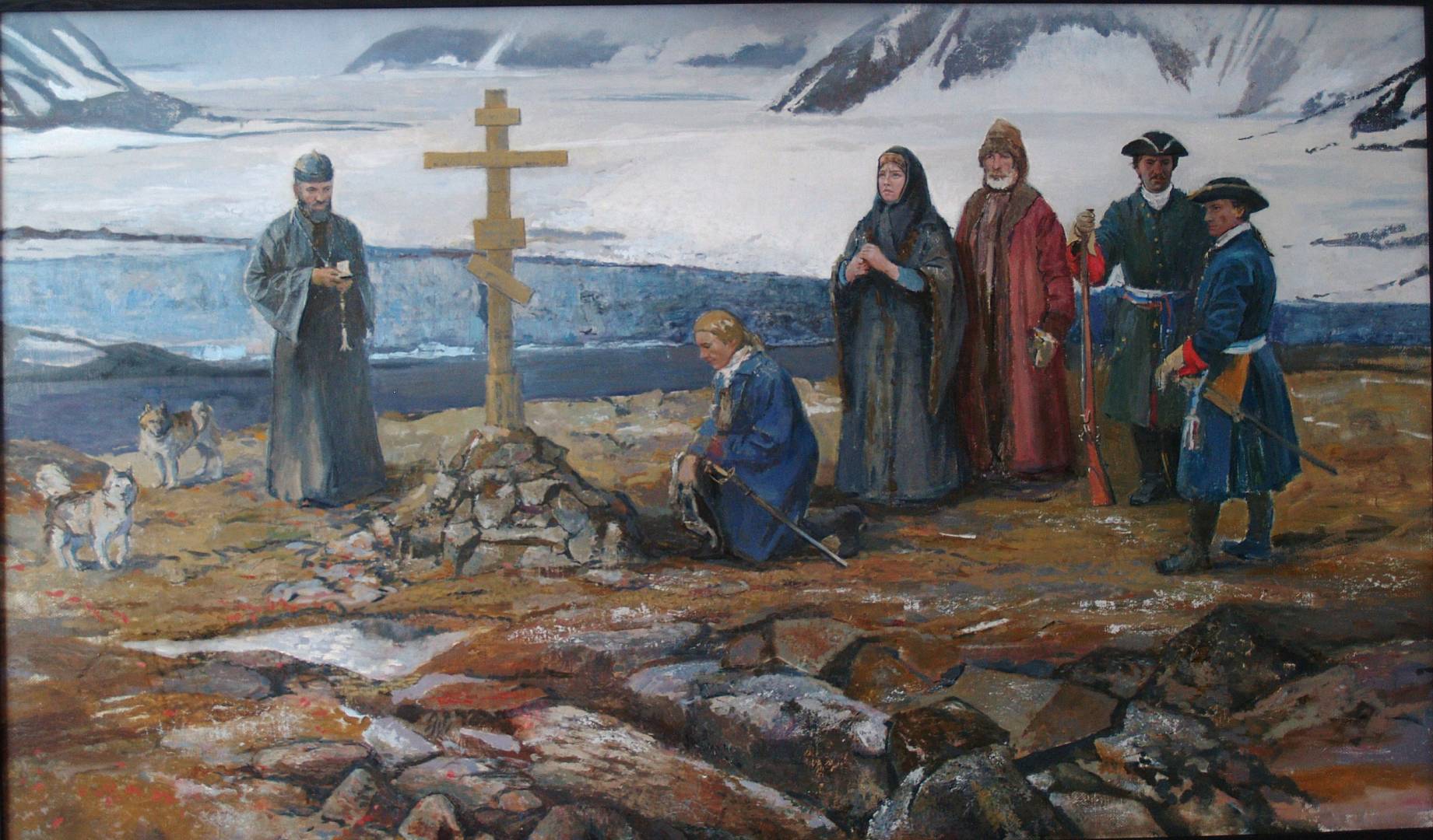 Эта картина посвящена истории Второй Камчатской экспедиции, позже названной «Великой Северной экспедицией». Под руководством полярного исследователя, лейтенанта Василия Прончищева. 30 июня 1735 года Прончищев отправился в путь из Якутска вниз по реке Лена на дубель-шлюпке «Якуцк». Перед его отрядом стояла задача описать побережье Северного Ледовитого океана от устья Лены до устья Енисея. Прончищев стал первым, кто нанёс на карту дельту Лены. Экспедиция примечательна тем, что вместе с ним в плавание отправилась его супруга Татьяна Федоровна Прончищева. Она стала первой в мире полярной путешественницей. К сожалению в ходе экспедиции супруги умерли, согласно исторической версии Василий Прончищев от осложнений после перелома. А его супруга от горя утраты. Их тела были погребены в устье реки Оленёк. Долгое время их могила оставалась без присмотра. Эта история вдохновила меня на создание картины «Земля испытания любви», - рассказала о своей работе Наталья Николаева.